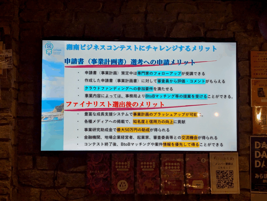 この夜のみらぼは、湘南ビジネスコンテスト(湘南ビジコン)エントリー締切直前ということもあり、